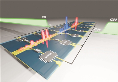 - 用于实现时间反射的实验平台示意图。控制信号(绿色)用于统一激活沿金属带状线分布的一组开关。在关闭/打开开关时,这种特制超材料的电磁阻抗会突然降低/升高,导致宽带前向传播信号(蓝色)部分时间反射(红色)。图片来源:《自然·物理学》
